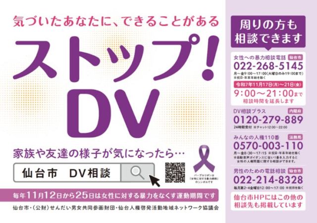 どーもー!仙台つーしんのせんだーいです!今回はPR記事になっていますよ~!11月12日~25日は「女性に対する暴力をなくす運動期間」って知ってましたか?仙台市…