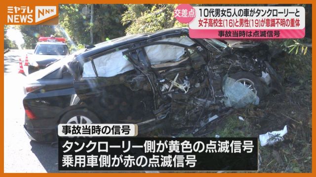 11日朝早く、宮城・大崎市の県道交差点で10代の男女5人が乗った乗用車がタンクローリーと出合い頭に衝突し、16歳の女子高校生と19歳の男性が意識不明の重体です。