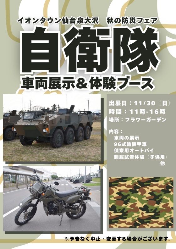 宮城県 仙台市 泉区にある イオンタウン仙台泉大沢で「自衛隊秋の防災フェア2025 in イオンタウン仙台泉大沢」が2025年11月30日(日)に開催されます…