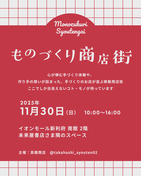 いかがお過ごしですか、nittaです。イオンモール新利府南館で2階・未来屋書店隣りで『ものづくり商店街』を、2025年11月30日(日)に開催するみたいです。…