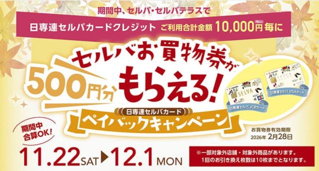 いかがお過ごしですか、nittaです。仙台市泉区泉中央のセルバ・セルバテラスの対象店舗★で、『日専連セルバカード ペイバックキャンペーン』を、2025年11月…