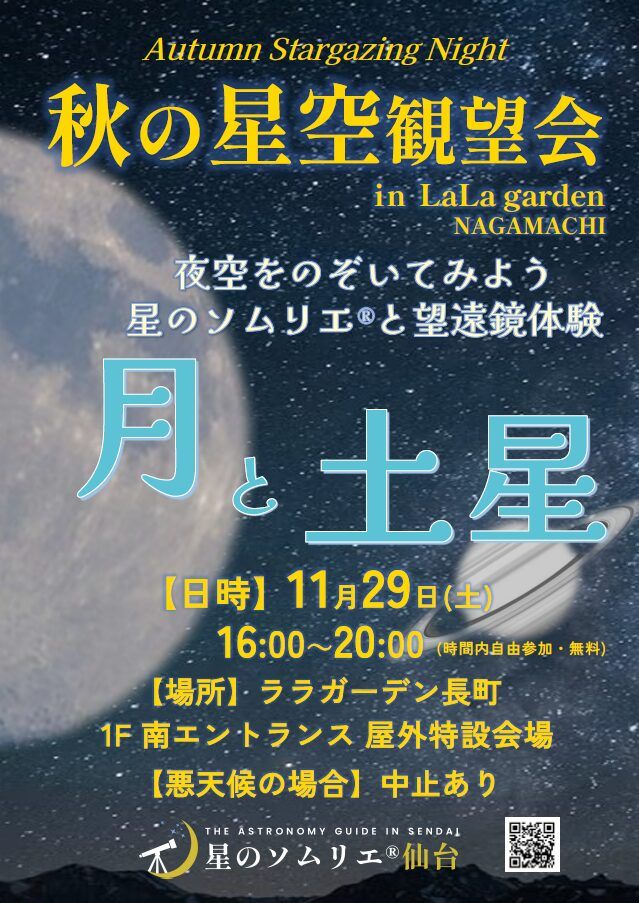 いかがお過ごしですか、nittaです。仙台市太白区のララガーデン長町・1階南エントランス屋外特設会場で、『秋の星空観望会「月と土星」』を、2025年11月29…
