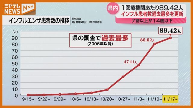 11月23日までの宮城県内の1医療機関あたりのインフルエンザ患者数は89.42人と、県の調査の“過去最多”を更新しています。
