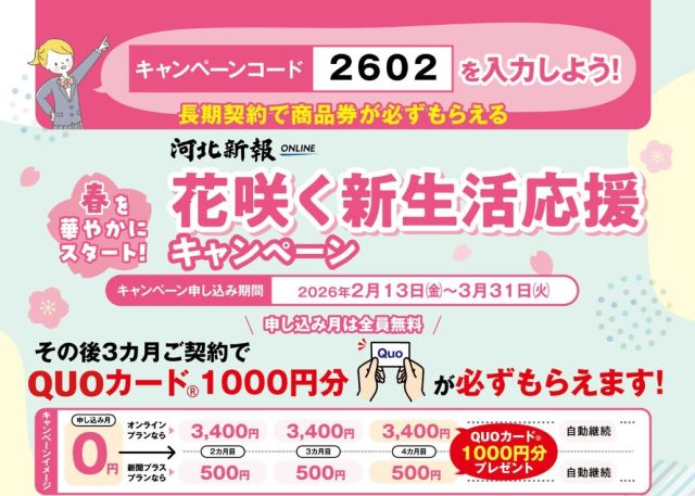 株式会社河北新報社のプレスリリース(2026年2月19日 18時44分)河北新報オンライン「花咲く新生活応援キャンペーン」を開催中!初月無料&QUOカード