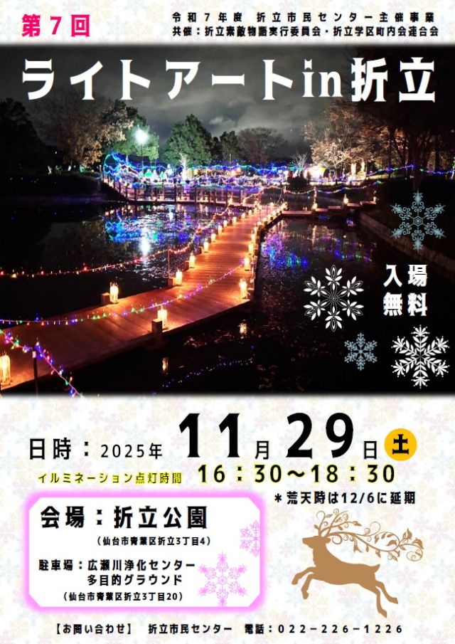 いかがお過ごしですか、nittaです。仙台市青葉区折立の折立公園で、『第7回 折立ライトアート』を2025年11月29日(土)に、開催するみたいです。(16時…