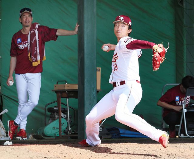 東北楽天は19日、沖縄県金武町ベースボールスタジアムで選手たちが練習に汗を流していました。投手陣は荘司が前田健から変化球のアドバイスを受けブルペンで投げ込み…