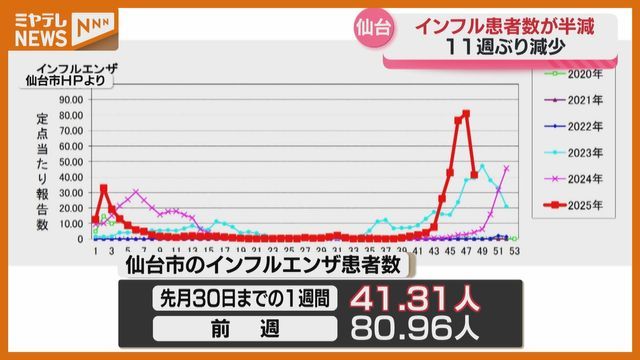 仙台市の最新の1医療機関あたりのインフルエンザ患者数が2025年11月17日週から比べ、半減しました。 仙台市の定点調査によりますと、2025年11月30日…