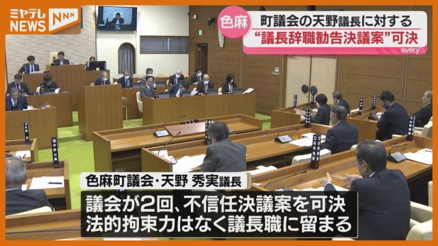 宮城・色麻町議会の議長が職員にパワハラ行為をしたとして、町議会は6日 議長職を辞職するよう勧告する決議案を、全会一致で可決しました。