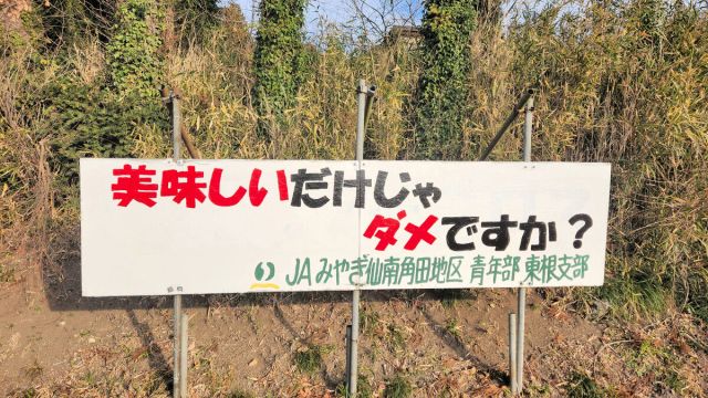 「美味(おい)しいだけじゃダメですか?」。宮城県角田市東根地区の県道沿いに、人気アイドル曲のフレーズのような看板が立つ…