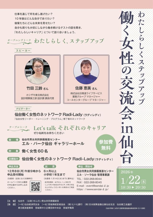 仙台市のプレスリリース(2026年1月9日 13時00分)「わたしらしくステップアップ 働く女性の交流会 in仙台」を開催します