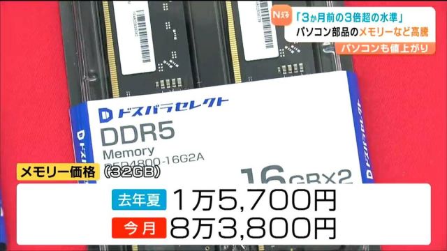 皆さんが使っているパソコンに関するニュースです。パソコンに内蔵されるメモリーなどといった部品の値上がりが続いています。値上がりは今後も続くとの予想もありパソコ…