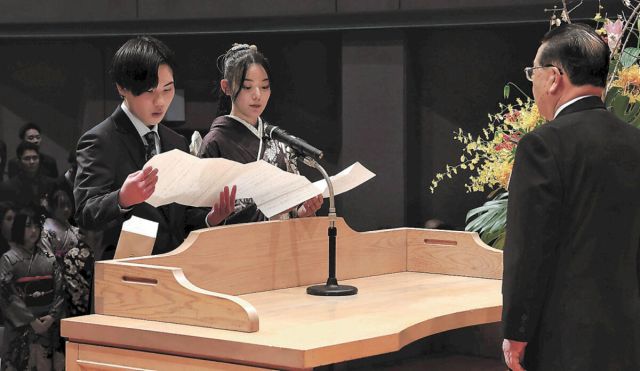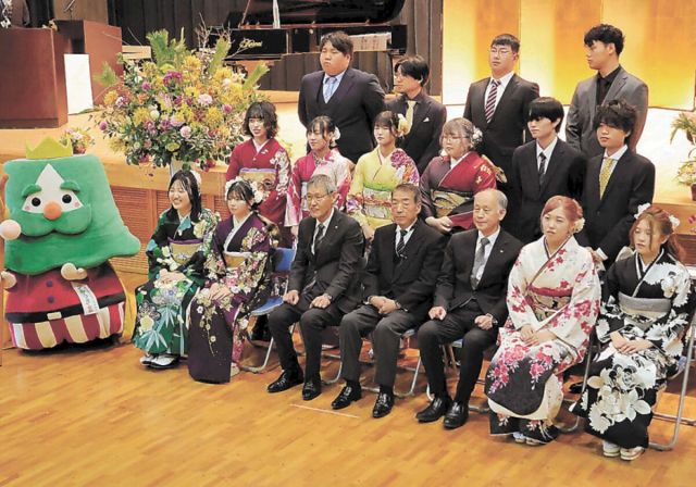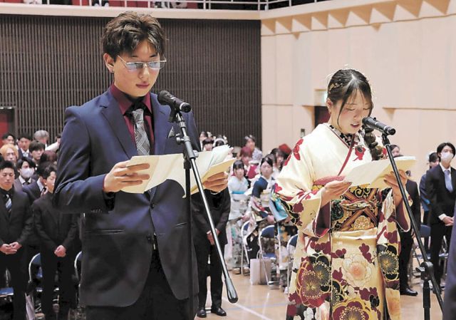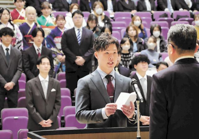 蔵王町の式典は町ございんホールであり、対象者104人のうち、88人が出席した。 出席者を代表してあいさつした東北医科薬科大2年の佐藤大志さん(20)は「東日…