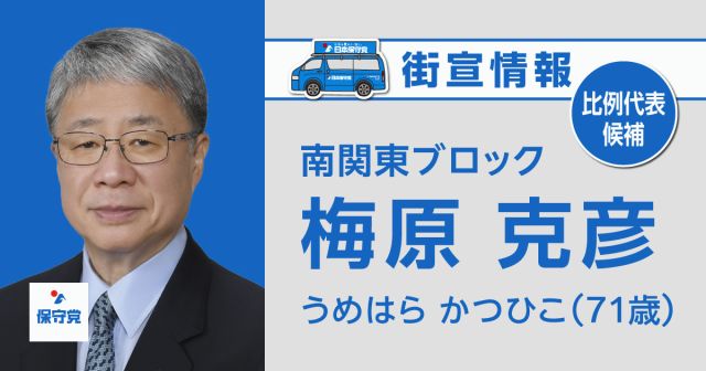 梅原 克彦 街宣情報はこちら ※移動時間や場所確保の関係上、スケジュールが変更になる場合がございます。最新情報