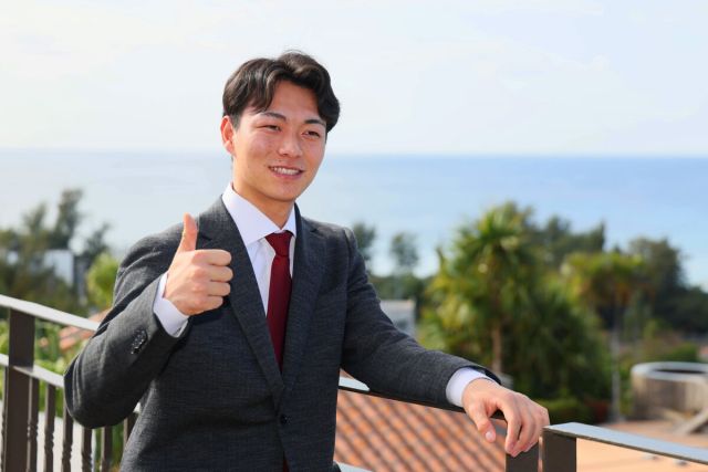 東北楽天の選手らは30日、仙台空港からキャンプ地・沖縄県に移動した。 宿舎に到着したドラフト1位新人の藤原聡大投手は、南国の海を背に意気込みを語った。 キャ…