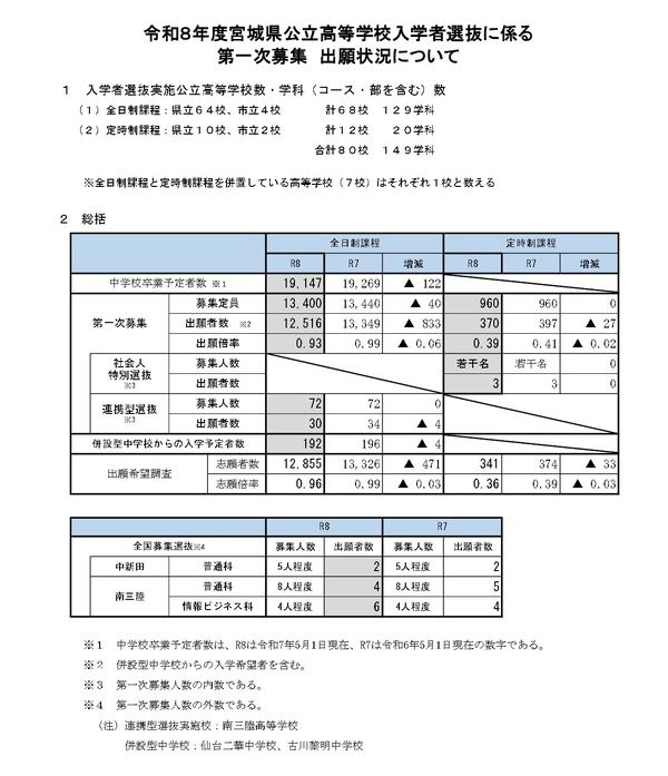 宮城県教育庁は2026年2月13日、2026年度(令和8年度)宮城県公立高等学校入学者選抜における第一次募集出願状況(確定)を発表した。全日制課程は募集定員…