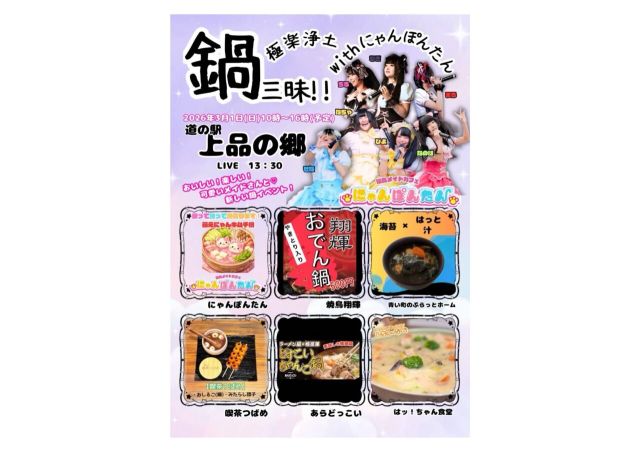 小船越二子北下にある、道の駅上品の郷にて、2026年3月1日に、鍋イベント、「鍋三昧!!極楽浄土withにゃんぽんたん」が開催されます! 主催の方にお伺いした…