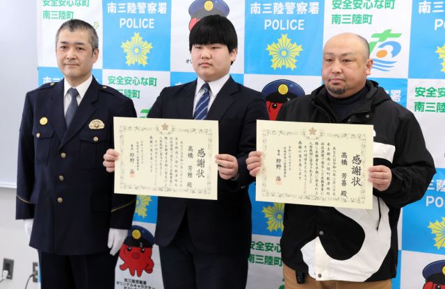 岸壁から足を踏み外し、海に転落した釣り人を救助したとして、宮城県警南三陸署は、南三陸町歌津の漁業高橋芳喜さん(45)と、長男の歌津中3年芳雅(よしつね)さん…