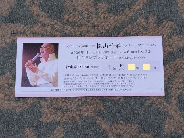 仙台公演のチケット(4月16日 仙台サンプラザホール) チケット代の振込完了でチケット確定 一昨日(3/18)、松山千春さんの2026年春のツアーの仙台…