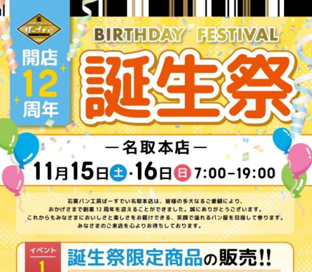 いかがお過ごしですか、nittaです。宮城県名取市の石窯パン工房ばーすでい・名取本店で、『開店12周年誕生祭』を2025年11月15日(土)、16日(日)の2…