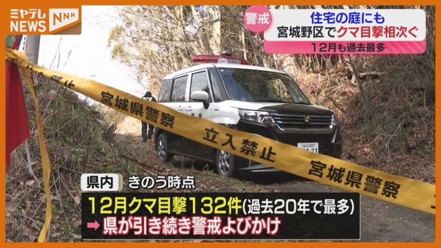 22日夜から仙台市宮城野区でクマの目撃が相次ぐなど、宮城県内の12月のクマの目撃件数は過去20年で最も多くなっていて、県が引き続き警戒を呼び掛けています。