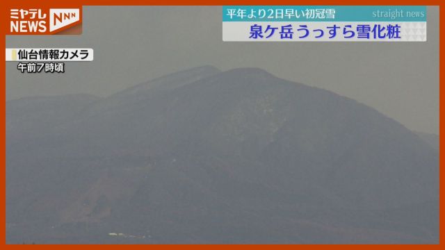 仙台管区気象台は11日朝、泉ヶ岳の初冠雪を観測しました。10日夜から11日朝にかけて西部の山では雪が降ったとみられ、仙台市内の情報カメラからもうっすらと雪化粧…
