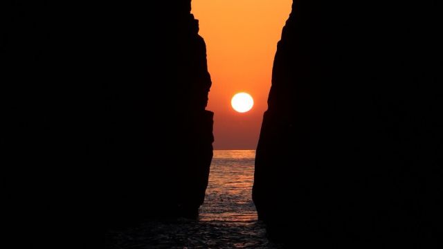 宮城県石巻市と南三陸町にまたがる景勝地の神割崎で、二つに割れた奇岩の間から昇る朝日を眺められる時期を迎えた。晴れ渡った15日には、神秘的な景観を写真に収めよ…