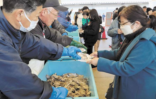 南三陸町の志津川仮設魚市場で15日、地元特産のカキをPRする「ラムサール志津川湾かき祭り」(実行委員会主催)があった。町内外から家族連れなど大勢の客が訪れ、…
