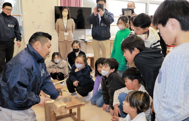 大工道具の使い方やものづくりの楽しさを伝えようと、名取市建設職組合(組合員237人)は、同市館腰小で特別授業を行った。 授業は午前と午後に行われ、4年生計6…