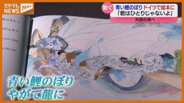 東日本大震災の後、宮城・東松島市で掲げられている青い鯉のぼり。 亡き子どもたちへの追悼の思いが海を渡り、ドイツで絵本になりました。