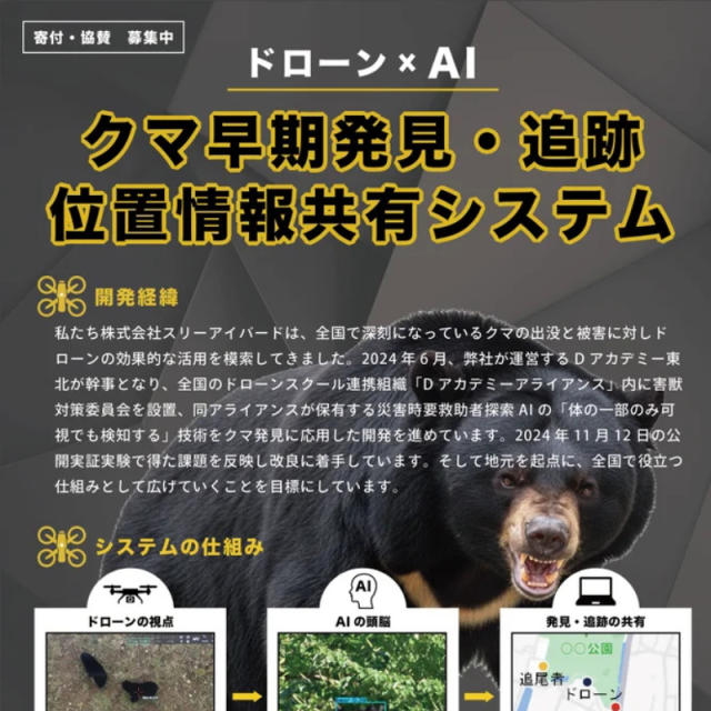 株式会社スリーアイバード(秋田県南秋田郡五城目町)は、ドローンとAI解析を組み合わせた「クマ早期発見・追跡・