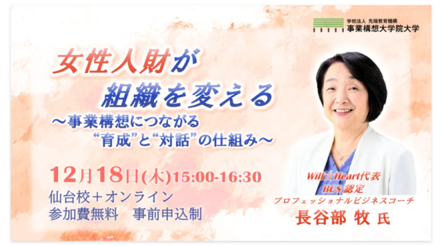 事業構想大学院大学 仙台校は、2025年12月18日(木)にセミナーおよび大学院説明会「女性人財が組織を変える~事業構想につながる"育成"と"対話"の仕組み~…