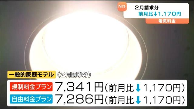 東北電力の2月請求分の電気料金は、一般的な家庭のモデルで前の月に比べ1170円下がり、7341円となります。東北電力によりますと、2月請求分の一般的な家庭のモ…