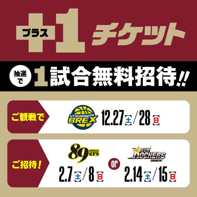 対象試合にご来場いただいた方の中から抽選で「2026年2月7日(土)・8日(日)vs仙台」「2026年2月14日(土)・15日(日)vsSR渋谷」の4試合のう…