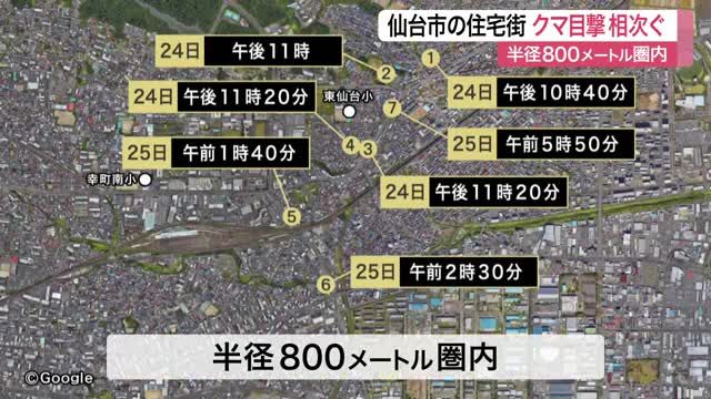 24日夜~25日朝にかけて、仙台市宮城野区東仙台の住宅地を中心に、クマの目撃が相次いでいて警察や区役所で警戒を強めています。
