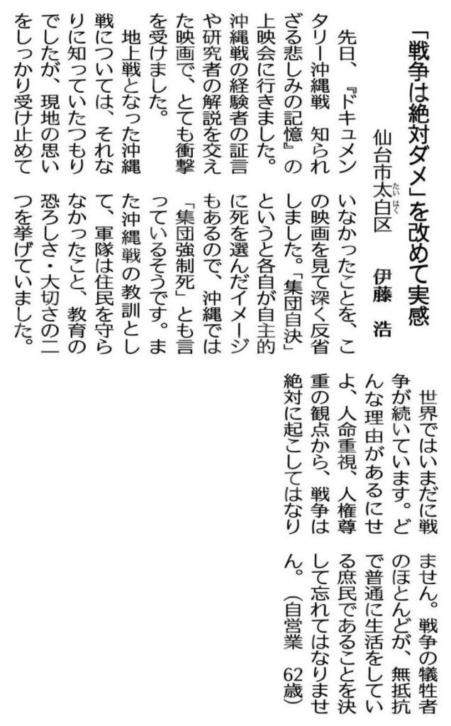 先日、『ドキュメンタリー沖縄戦 知られざる悲しみの記憶』の上映会に行きました。沖縄戦の経験者の証言や研究者の解説を交えた映画で、とても衝撃を受けました。 地上…
