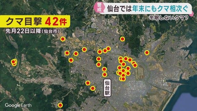 宮城県では、本格的な冬を迎えてもクマの出没が続いています。6日夜は、仙台城跡の近くでクマ1頭が目撃されました。