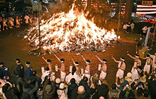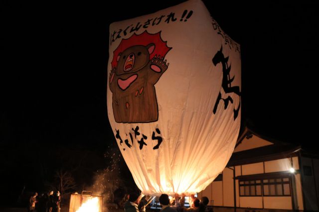 宮城県栗原市築館の通大寺で14日、どんと祭があり、平和や地域の安全を願う紙風船が夜空に掲げられた。 紙風船は高さ5メートル、幅3メートルの円筒形。午後5時4…