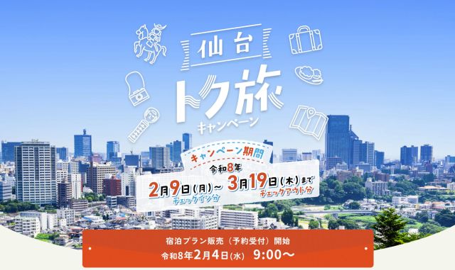 宮城県仙台市は、宿泊促進キャンペーン「仙台トク旅<第2期>」を2月9日から実施する。