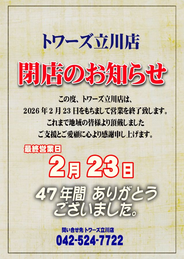 東京都立川市にて営業してきたパチンコホール『トワーズ立川店』が、2026年2月23日(月・祝)の営業をもって閉店する。同店は2月3日、公式X(旧Twitter…