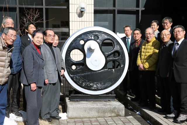大崎市松山ふるさと歴史館入り口前にある蒸気機関車(SL)の動輪が塗装された。お披露目会が1月31日、近くの松山公民館であり、関係者たちが「人車」に続く松山の交…