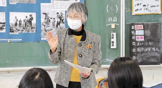 戦争の悲惨さと平和の大切さを子どもたちに伝えようと、第2次世界大戦で旧満州(現中国東北部)から引き揚げた宮城県角田市の鎌田三千子さん(86)が、同市の桜小(…