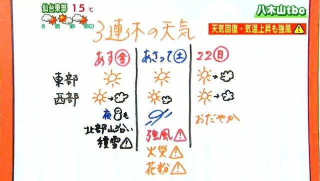 すっきりと晴れるでしょう。空気が乾いてきたため、火の取り扱いに注意してください。高気圧に覆われる所が多いでしょう。東北地方と北海道は、20日夜にかけて前線が通…