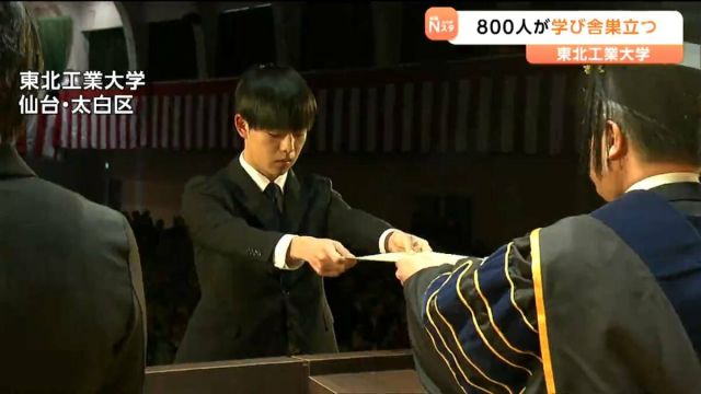仙台市にある東北工業大学の卒業式が19日行われ、約800人の学生が学び舎を巣立ちました。東北工業大学では、学部生と大学院生合わせて808人が卒業と修了を迎えま…