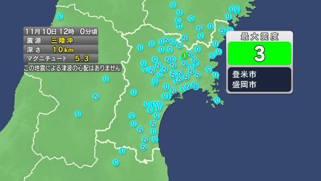 10日12時00分ころ、地震がありました。 震源地:三陸沖 北緯39.2度 東経143.0度 深さ 10km 地震の規模(マグニチュード)は5.3と推測され…