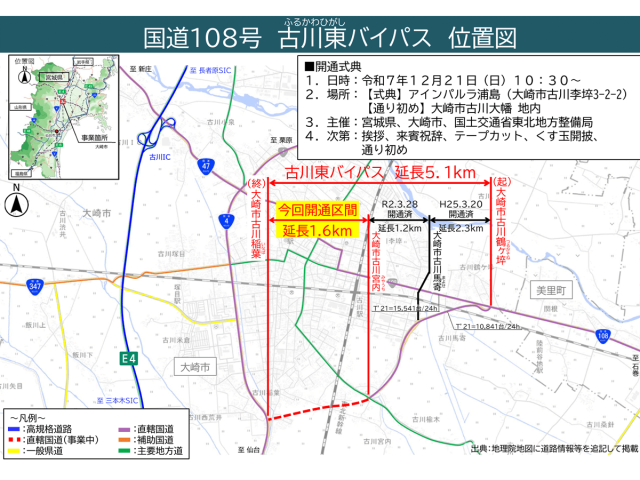 国道108号「古川東バイパス」が2025年12月21日(日)15時に全線開通します。今回開通するのは、宮城県大崎市古川宮内から古川稲葉までの延長1.6km区…