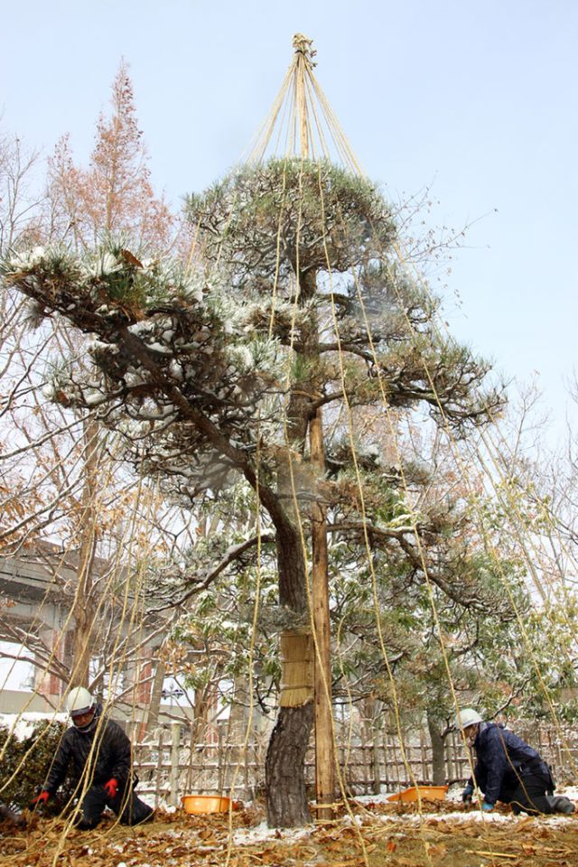 多くの市民に親しまれている県北随一の本格茶庭、大崎市祥雲閣で4日、樹木の「雪吊り」作業が行われた。本格的な冬の訪れを感じさせる雪と寒さの中、朝から作業が行われ…