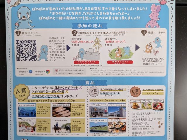 仙台市宮城野区から名取市までの海手(うみのて)を巡るイベントが開催中です。 イベント名:ぼのぼのと巡る謎解き×ショッピング ぐるっと、海手スタンプラリー 開催…