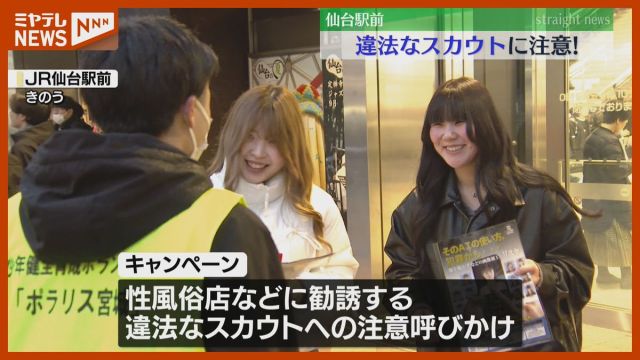 女性を性風俗店などへ勧誘する違法なスカウトに注意するよう、警察が JR仙台駅前で呼びかけました。