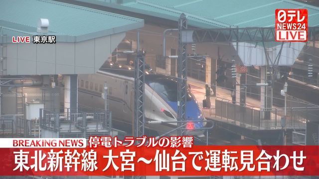 JR東日本によりますと、東北新幹線は停電の影響で大宮-仙台駅間の上下線で運転を見合わせています。 運転再開の見込みは立っていません。