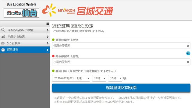宮城交通(仙台市)とミヤコーバス(同)は2日、路線バスの遅延証明を乗客が同社サイトからスマートフォンなどで取得できるウェブ発行システムを導入した。運転士が手…